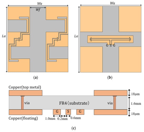 Figure 1c shows the cross-sectional structure of the antenna element. The proposed antenna exhibited a three-layer structure, in which copper foil was attached to the front and back of FR4 (ε_r = 4.4, tan δ = 0.02). The back metal was not connected electrically to the front metal, and the connector directly contributed to radiation as it was surface-mounted. The connector was attached to reflect the back radiation of the slot antenna and obtain a high gain in the frontal direction (this is known as floating metal). The back metal of the patch antenna served as the ground, and a board thickness of λ/4 relative to the operating frequency was required for the radiation mechanism. However, the slot antenna imposed a slight effect on the characteristics of the slot antenna, and its weight could be reduced. The floating metal was attached to the back of the slot antenna, and we attempted to achieve a lightweight yet high-gain antenna.