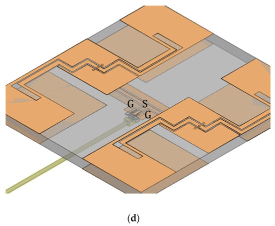 Figure 9 shows the structure of the proposed 2 × 2 array antenna. The feeding point was the one-port of the back co-planar branch line. The back co-planar branch line was connected by the same ground signal as the front co-planar line, and power was supplied to the two antenna elements arranged in the ±x direction.