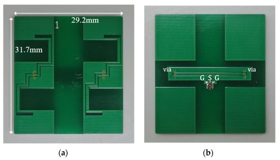 Figure 10 shows a photograph of the 2 × 2 array antenna board. The board manufacturing and mounting service of P-ban.com Corp was used for the prototype. The board surface was surface treated with a lead-free solder leveler (which is RoHS-compliant). The connector was bonded to the back co-planar feedline with the aligned ground signal. The via connecting the back and front surface co-planar lines had a via diameter of 3.0 mm and a land diameter of 6.0 mm. The final antenna had the following dimensions: 29.2 mm × 31.7 mm, thickness = 1.636 mm.