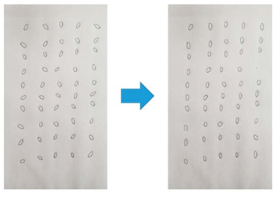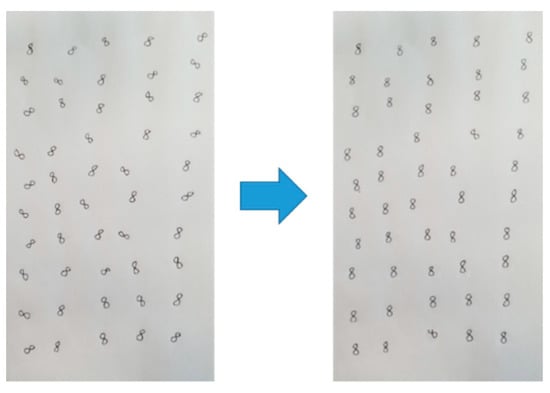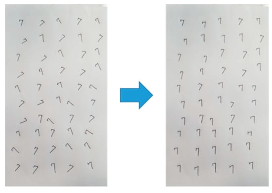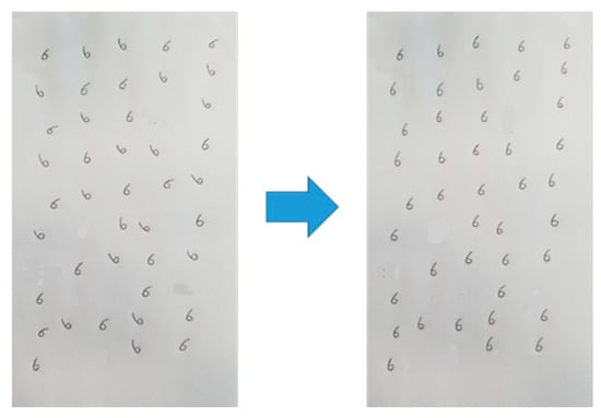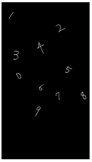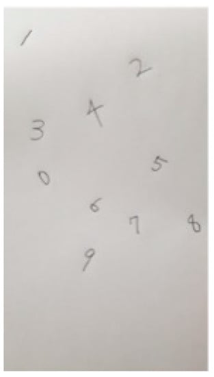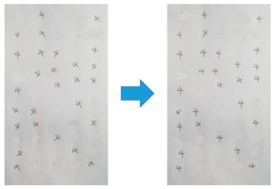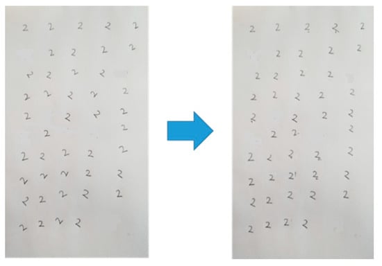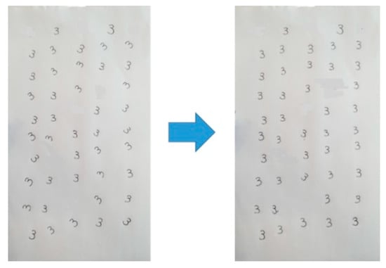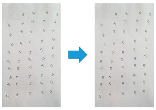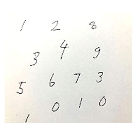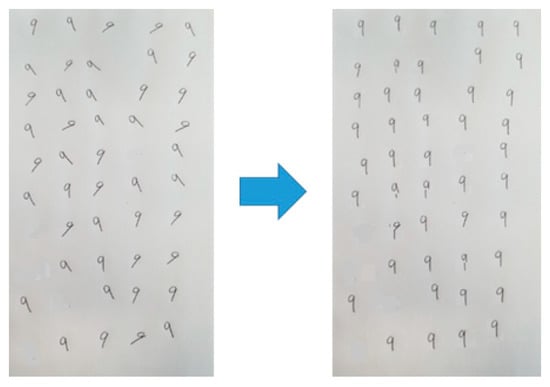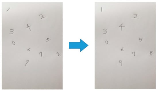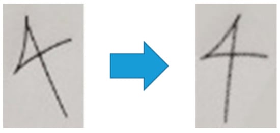 The input and output images of numbers 0–9 are shown in Figure 13, Figure 14, Figure 15, Figure 16, Figure 17, Figure 18, Figure 19, Figure 20, Figure 21 and Figure 22. Table 1 shows the success rate of the angle corrections for each number. Table 2 shows the success rate of the angle corrections for each number when the tilt angle is less than 30°. Table 3 shows the success rate of distinguishing between “4” and other digits.