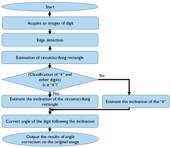 A sample input image is displayed on the left side of Figure 2. As shown in the figure, some digits are inclined at a certain level. In this study, we first estimated the tilt angle and then performed tilt correction following the angle. The main processing flow for tilt estimation and correction is shown in Figure 3.