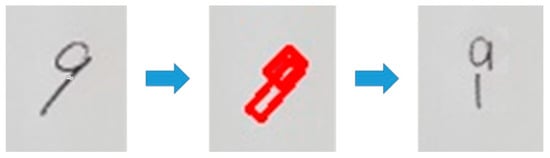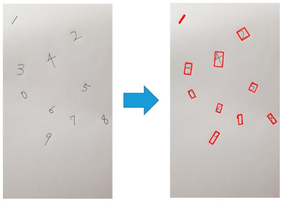 The angles of the digits other than 4 were successfully corrected with a probability of 90% or more. The cause of the failure to correct the angle was that the circumscribed rectangle considering rotations was not generated to surround the entire number. The reason is that during the binarization process, some pixels belonging to the digit line were detected as background pixels. An example of the failure to generate a circumscribed rectangle is shown in Figure 23. As shown in the figure, if one number is split into several parts and recognized, the processing will fail. The number is split and recognized because the lines of the numbers are thin, and the lines may disappear at the binarization stage. However, if the line is clearly written this error will not occur. Solving this issue by proposing the new binarization approaches or applying the latest methods in the literature is an important future work [39]. In Table 1 and Table 2, the slope correction rate is higher regarding many digits when the slope is within approximately 30°. Therefore, this method is considered to be effective when the angle of the number is within 30°.