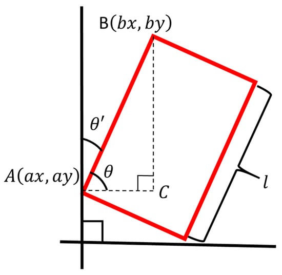 Figure 6 shows how to find the slope of the long side of the estimated circumscribed rectangle. Because the coordinates of the four corners of the rectangle can be obtained from the circumscribed rectangle, the length was calculated using those coordinates. As shown in Figure 6, with the corner points of the rectangle (ax, ay), (bx, by), the side length of the axis l can be expressed by Equation (1). Consequently, the lengths of the long and short sides of the rectangle are calculated. Then, the long side length is used. In Figure 6, the rectangle , which represents the angle of the long side against the horizontal direction, can be expressed by Equation (2). Conversely, , which represents the angle of the long side against the vertical direction, can be expressed by Equation (3). becomes the tilt and considered the tilt of the digit.