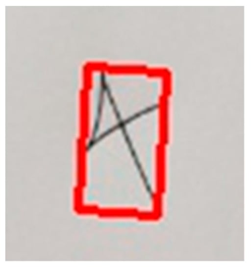 To determine the circumscribed rectangle, the image was first binarized based on discriminant analysis [22]. This time, digits written on a consistent-color paper were used. The binarization following discriminant analysis can separate the digits and background when the digits are written with a colored pen or pencil. Subsequently, the lines related to the digits were further extracted using the Canny edge detector [23,24,25]. For character line components, they were sandwiched between two close contours (edges). Through this feature, the lines that correspond only to the digits were determined, and objects other than the digits were removed. Figure 4 shows an example image obtained following these processes. Subsequently, we calculated the slope of the long side of the circumscribed rectangle. In this work, a vertical circumscribed rectangle was not considered, and the minimum circumscribed rectangle surrounding the digit was estimated, as shown in Figure 5.