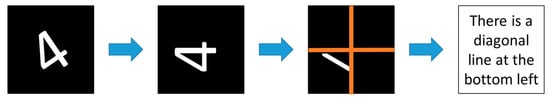 In this study, we detected diagonal lines by calculating the white pixels in each of the four parts gained following the cross part of a digit “4” image (Figure 11). The part containing the most white pixels includes the diagonal line. The diagonal line was detected using this feature.
