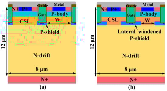 The proposed LW-MOSFET features the laterally widened P-shield region and higher doped CSL compared with the CT-MOSFET, as shown in Figure 1b. The W represents the distance between two widened P-shield regions. Moreover, the manufacturing process of the proposed structure is fully compatible with the standard CT-MOSFET, and only requires additional buried p-layer process adjustment. The detailed structure parameters are summarized in Table 1.