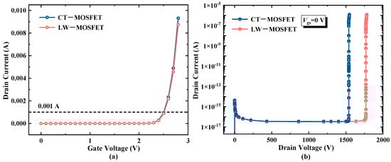The (a) threshold voltage and (b) breakdown voltage curves of the CT-MOSFET and LW-MOSFET.