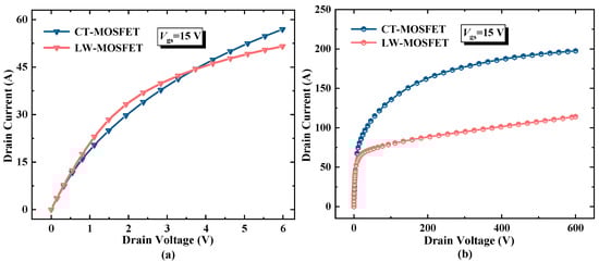 Figure 4 shows the simulation results of the forward I-V characteristic curves for the two devices. It can be found that the specific on-state resistances (Ron, sp) of the CT-MOSFET and LW-MOSFET are 6.86 mΩ·cm2 and 6.26 mΩ·cm2, respectively. The lower Ron, sp of the LW-MOSFET is because the lateral widening of the P-shield allows the increase in CSL doping concentration without sacrificing the BV ability. However, a higher doping concentration of CSL in the CT-MOSFET is limited due to the degeneration of BV characteristics. Therefore, the LW-MOSFET can provide a better compromise between the on-state current and the blocking ability.