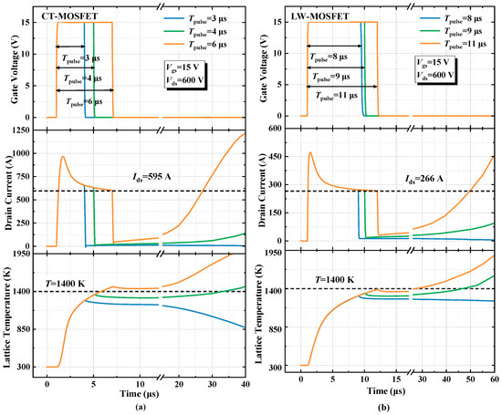 The SC simulation results of (a) CT-MOSFET and (b) LW-MOSFET under different gate pulses.