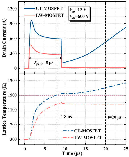 The SC simulation comparison results between the CT-MOSFET and LW-MOSFET at Tpulse = 8 μs.