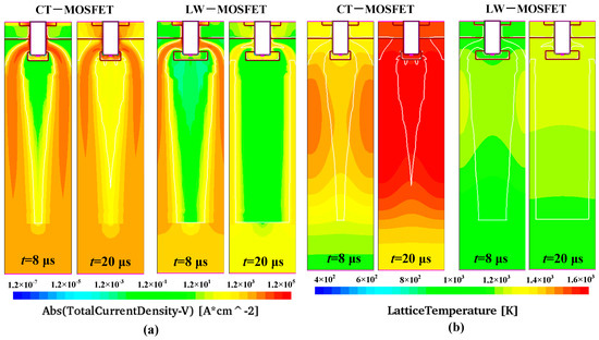 The (a) total current density distribution and (b) lattice temperature distribution inside the CT-MOSFET and LW-MOSFET at time points of 8 μs and 20 μs.