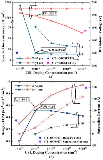 The (a) Ron, sp, BV and (b) Baliga’s FOM, saturation current (Vds = 600 V) of the proposed LW-MOSFET with the varied CSL doping concentrations and W.