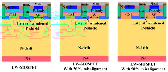 In addition, the misalignment situation of the LW-MOSFET between the trench gate and P-shield region is also inspected, as shown in Figure 10, and the simulation results are summarized in Table 4. It can be seen from the simulation data that the static parameters and saturation current of the LW-MOSFET almost keep constant if the misalignment position between trench gate and P-shield region is within 30%, which can meet the most fabrication tolerance. If the misalignment exceeds 40%, the saturation current of the LW-MOSFET is still significantly suppressed, but the static parameters are slightly degraded compared with CT-MOSFET. That means, if the reasonable misalignment situation occurs, the changed LW-MOSFET structure still exhibits a significant optimization on the Baliga’s FOM and saturation current compared with the CT-MOSFET.