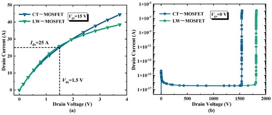 Figure 2a,b show the threshold voltage (Vth) and the blocking characteristic curves of the CT-MOSFET and LW-MOSFET, respectively. According to Figure 2, the Vth of the two MOSFETs is 2.5 V at Ids = 1 mA, and the breakdown voltages (BVs) of the CT-MOSFET and LW-MOSFET at Ids = 1 μA are 1547 V and 1780 V. It can be known that a better forward voltage blocking ability is acquired in the LW-MOSFET. The excellent BV of the LW-MOSFET is attributed to the local charge balance between the widened P-shield and the adjusted N-type CSL region.
