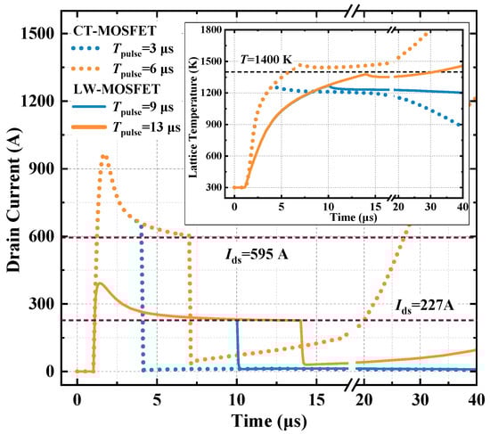 From the SC simulation curves under different SC pulses shown in Figure 6a, the SC saturation current of CT-MOSFET is 595 A. It can be seen that the CT-MOSFET returns to the normal state when the SC pulse time (Tpulse) is 3 μs. However, if the Tpulse is over 4 μs, the rising drain tail current and lattice temperature with positive feedback are found although the gate signal is already turned off. In general, it is hard for SiC MOSFETs to survive short heating above 1300–1500 K owing to oxide or contact metal failure [22]. Therefore, the failure boundary condition is defined at the lattice temperature over 1400 K. It can be seen in Figure 6a that the lattice temperature of CT-MOSFE exceeds 1400 K due to the thermal runaway when the Tpulse is over 4 μs, and eventually leads to the device’s burnout. Therefore, the simulation results indicate that the safety SCWT of the CT-MOSFET is 3 μs at Vds = 600 V and Vgs = 15 V.