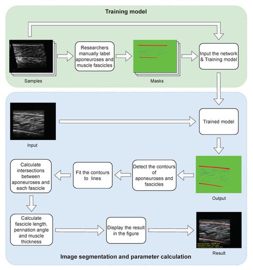 Since ultrasound imaging has been widely used in clinical medicine because of its painless, portable, and inexpensive features, the data interpretation of ultrasound images has always been a pivotal task. Traditionally, the quantitative parameters of skeletal muscle ultrasound images are manually measured or annotated using interactive software, but it is time-consuming, cumbersome and error-prone. Therefore, developing a convenient and accurate method for automatic measurement of muscle ultrasound images poses a new challenge. Recently, several methods of applying image processing technology to measure and quantify muscle ultrasound image parameters have emerged [8,9,10,11,12,13]. Zhao et al. [8] proposed an automatic linear extraction method based on local radon transformation (LRT) and rotation strategy to detect the pennation angle in ultrasound images. However, this method relies on the choice of edge detector. The measurement of images is often semi-automatic, and is not suitable for images containing different complex noises. Zhou et al. [12] combined the Gabor wavelet with the Hough transform, and used prior knowledge of the geometric arrangement of fascicles and aponeuroses in ultrasound images to realize the automatic measurement of pennation angle and muscle fiber length. Although this method performs well on images with high speckle noise, it lopsidedly relies on the parameterization of some features. The selection of parameters is empirical, and there are some uncertainties in practical application. Salvi et al. [13] proposed a method called MUSA to measure the muscle thickness on different ultrasound images of skeletal muscle. This method detects the fascicles in the middle of the aponeuroses through the Hough transform, and performs an iterative heuristic search on fascicles in the region of interest to identify contours of the aponeuroses and calculate muscle thickness. This feature detection method can locate the direction of representative fascicles. However, the speckle noise and the presence of intramuscular blood vessels tend to blur the critical features of muscle fibers, which will increase the difficulty of measurement. In addition, the MUSA method only measures the parameter of muscle thickness, which does not help to fully reflect the muscle state and structure. These image processing methods have initially solved the problem of data interpretation of muscle ultrasound images and performed well in accuracy. However, there are still various shortcomings that need to be further improved.