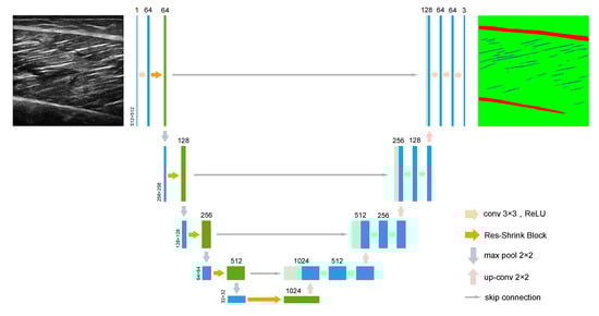 The large size images of 512 × 512 are selected as the input, which is different from the methods of inputting small images for neural networks training fast. Because muscle ultrasound images are generally blurred and the quality of images is poor, a larger size of images avoids the loss of pixel information in the down-sampling layers, so as to ensure more accurate segmentation. As shown in Figure 2, each unit in the encoder includes a residual shrinkage block for extracting image features and a down-sampling layer which uses a max-pooling of 2 × 2 to reduce the feature map size by half. The decoder is the same as the standard U-Net, and the feature map is restored to the original size through multiple 3 × 3 deconvolutions. The deconvolution is essentially transposed convolution, which was proposed by Zeiler [27] in 2010. The feature fusion of the RS-Unet is in a typical U-Net fashion by skip connection. It transmits feature information by clipping and splicing the same level feature maps of encoder and decoder. It enables spatial information to be directly applied to deeper layers to obtain more accurate segmentation results. The skip connection in RS-Unet adopts direct splicing without clipping, which preserves the edge information of the image as much as possible. In the last layer, the feature map passes through a softmax function to output a three-channel mask. Each channel corresponds to a different pixel classification, which are muscle fibers, aponeuroses and background. Because each pixel in the mask represents the probability of each classification. The channel with the maximum probability value is selected by the threshold, which ensures the accuracy and clear of segmentation results.