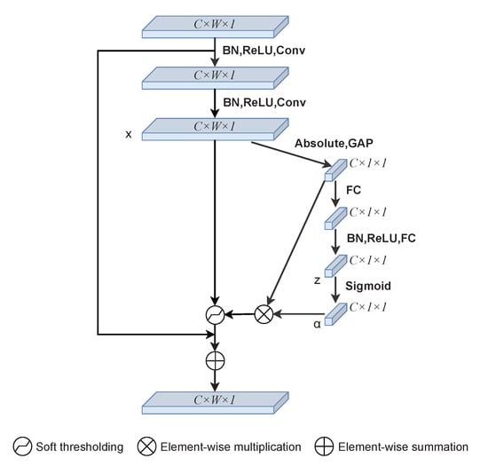 is the threshold of the cth channel of the feature map, h, w, c are the indexes of width, height and channels of the feature map x. Through soft thresholding, the features irrelevant to the current task are set to 0, and the features relevant to the current task are retained, thus realizing the suppression of noise. Compressing to the channel domain for convolution enhances the learning ability of the channel features and improves the extraction ability of the model for important features. The DRSN also retains the characteristics of ResNet [22]. The residual learning structure is realized by shortcut connection, which performs the equivalent mapping and solves the problem of network degradation in the process of network layer deepening.