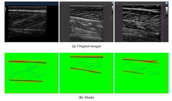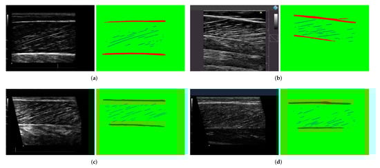 We collected ultrasound image datasets from different types of movements conducted by different groups of the population (including young people, elderly people, etc.). These data include a large number of videos and images, which are obtained from muscle tissues in different parts of the body (medial and lateral gastrocnemius, vastus lateralis, tibialis anterior) using a variety of ultrasound devices.To ensure the diversity of data, we collected data from different sources. Some of these were collected by experts from Shenzhen Institute of advanced research, Chinese Academy of Sciences, and some are from the research of J. Cronin et al. [26]. A set of 508 samples was obtained by cutting images and randomly extracting videos by frame. Three researchers used FIJI software [32] to manually label the dataset to generate masks. Each mask is divided into three parts with different colors, with the blue part representing muscle fibers, the red representing aponeuroses, and the green representing background. Figure 4 shows the samples of the manually labeled dataset. The dataset is divided into a training set and a validation set according to the ratio of 9:1. Another 50 samples are randomly selected from the videos besides the training set to form a test dataset, which ensures the reliability of experiment results. These data have received ethical approval from the relevant committees of Shenzhen Institutes of Advanced Technology, CAS.