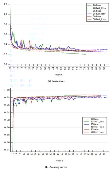 When the training loss of model decreases and the test loss remains unchanged or increases, that is, the overfitting phenomenon occurs, the training will be stopped in advance. To obtain the optimal model, we trained on datasets of different sizes. The three sizes of data set with 208, 358 and 508 images were chosen, respectively. The loss function of training was calculated using the dice loss function in Equation (5). Figure 5a,b shows the loss curves and accuracy curves of the training dataset and the validation dataset with different sizes of data set. The results show that the model performs better when the size of data set is 508. Complex network models need larger data sets for training to achieve higher accuracy. Too small data sets, such as those containing 208 pictures, shown in Figure 5, may lead to over fitting of the model. However, the data set with too large an amount of data will also contain more noise. So, choosing an appropriate size of data set is important for training. Through training with 508 images, the training loss and verification loss of the model decrease continuously until they become stable, and the accuracy rate is high, indicating that the model training process is successful.