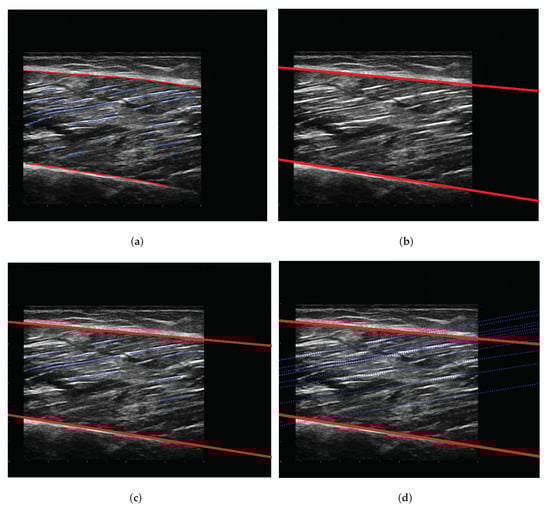The post-processing steps for outputs. The blue line represents the fascicles; the red line represents the edge of the deep and superficial aponeuroses. (a) Contour extraction. (b) Linear fitting of aponeuroses. (c) Linear fitting and screening of fascicles. (d) Calculation of intersection.