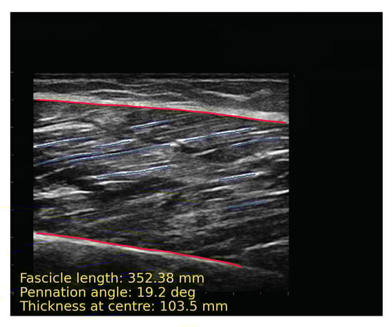 The result of automatic analysis of the muscle ultrasound image. The red line is the contours of aponeuroses, and the blue line is the longest 10 representative fascicles. The calculation results of muscle parameters are displayed at the bottom of the image.