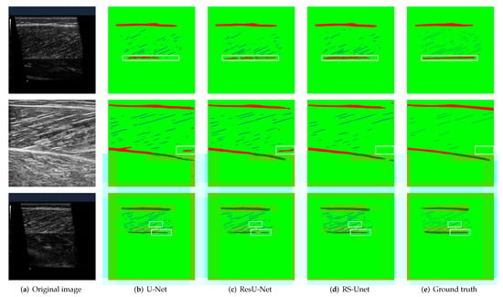 Comparison of visual segmentation results of different models. The boxes in white show the difference of segmentation results. The red area of the segmentation result represents aponeuroses, the blue area represents muscle fibers, and the green area represents the background. (a) Original images. (b–e) Segmentation results of different models. The aponeuroses and muscle fibers of the proposed model are closer to the ground truth.