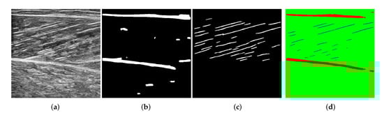 The segmentation results of the DL method and the proposed method. (a) The original image. (b) The segmentation result of aponeuroses by the DL model. (c) The segmentation result of fascicles by the DL model. (d) The segmentation result by the proposed model.