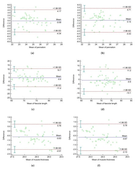 The quantitative parameters of the muscle ultrasound images are obtained by post-processing. In order to further validate the effectiveness of our proposed method, we compare the results of parameters with the DL method and the manual method. As a classic consistency evaluation method, Bland–Altman plots [35] were proposed in 1986. In our experiment, they were used to analyze the consistency between the two methods and the manual method. The 50 images of the test dataset were labeled by three researchers, respectively. Figure 11 shows the Bland–Altman plots of the DL method and our method with the manual method by the first researcher. The abscissa is the mean value of two methods, and the ordinate is the mean difference of the measurement results. The solids indicate the mean of the differences, and the dashed lines represents the 95% agreement limit of the mean difference ± 1.96 standard deviation (SD). Figure 11a,c,e is the consistency analysis of the muscle parameters measured by our method and the manual method. The results of our method are almost between the 95% consistency bounds, which proves that our method is in good agreement with the manual method. Moreover, the mean differences in the pennation angle, muscle fiber length, and muscle thickness between our method and manual method were 0.09°, 0.4 mm and 0.63 mm, respectively. The results were less than the mean difference of 0.14°, 0.9 mm and 0.67 mm between the DL method and the manual method, as shown in Figure 11b,d,f, respectively. In order to reduce the subjective factors and make the experiment more convincing, the two methods were compared with the ground truth labeled by two other researchers. The standard deviation (SD), root mean square errors (RMSEs), 95% agreement bounds for the DL method and our method are shown in Table 4.