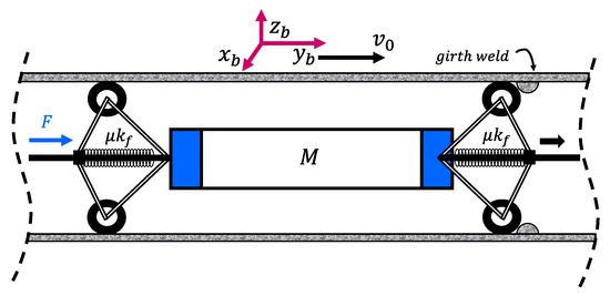 x is the displacement on the y axis in body coordinate system O x b y b z b (m); M is the mass of the PIG (kg); μ is the coefficient of friction between the PIG and the pipe wall; a is the interference of the system; k f is the stiffness of the springs (N/m); F is the driving force in the pipe (N); v 0 is the initial speed, expanding the nonlinear function F ( v 0 x ˙ ) around the point v = v 0 and omitting the higher-order terms, as follows:
