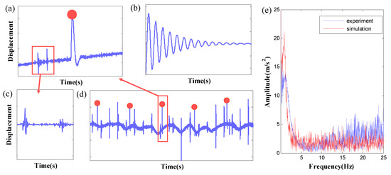 Figure 3. Collision response between PIG and the weld, (a) is a segment of the amplitude change of the accelerometer, (b) is the theoretical response Equation (5) ( 0 < n < 1 ), (c) is the rhythmic burst noise, (d) is the amplitude change of the accelerometer in the experiment, (e) is the amplitude of collision response in frequency domain (a segment of accelerometer data for the y-axis).