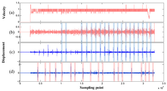 Figure 4 shows the consistency analysis of IMU and odometer. In Figure 4, (a) is the discrete velocity measured by odometer (m/s); (b) is the detail coefficient of the wavelet decomposition of (a), the burst noise of the velocity can be extracted by wavelet decomposition; (c) is the wavelet decomposition of the accelerometer measurement data, the light blues mark the spikes successively. By comparison, the noise spikes in (b,c) appear in the same location; (d) is the wavelet decomposition of the accelerometer output in another pipeline experiment, in which the frequency of applied pulling force is changed. As shown by the red marks, the location of the spikes in (d) has been significantly changed compared to (c). Therefore, rhythmic bursts noise caused by uneven manual operation.
