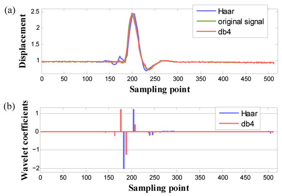 Selection of a suitable basis mother wavelet filter is necessary for the signal processing in wavelet domain. In accordance with the definition of wavelet transform, the coefficient of wavelet decomposition will be more localized if the mother function is more similar to the analyzed signal, and this is the optimal mother wavelet. Figure 5 plots the collision signal of accelerometer measurement data in the experiment, and the wavelet coefficients (decomposition level 4) are generated and ordered. Figure 5a plots reconstructed signal of the collision response using Haar and Daubechies (order 4) filter. Figure 5b plots significant wavelet coefficients of underlying collision signal decomposed with Haar wavelet and Daubechies wavelet (db4). The plot reveals better localization property of wavelet coefficients with db4 in comparison to Haar wavelet. This signifies need of an optimal wavelet basis function for better reconstructed signal processing.