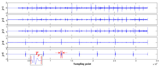 Accelerometer measurement data is decomposed with decomposition level 5. Figure 6 shows the process to extract CPs, the amplitudes of the detail coefficient denote the correlation of the moving mother wavelet and the signal, scale j is looking for the well-matched frequency. The bigger the j, the more obvious the singularity of the collision response. When j = 5, the amplitude spikes are the location of the weld, which can be regarded as the CPs, T p is collision time, CPn is a series of CPs. When j = 1, the frequency of burst noise is best match, and the position of the pulling force can be extracted. The figure reveals the local instability of the signal, which is conducive to the recognition of characteristic positions.