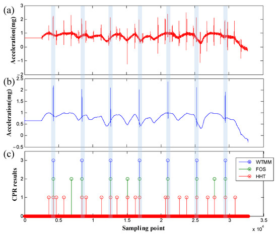Figure 7. Comparison of different CP recognition methods: (a) is the raw value of the accelerometer measurement data, (b) is the data denoising and CP identification based on WTMM, (c) is the comparison of CP identification based on WTMM, FOS, and HHT.