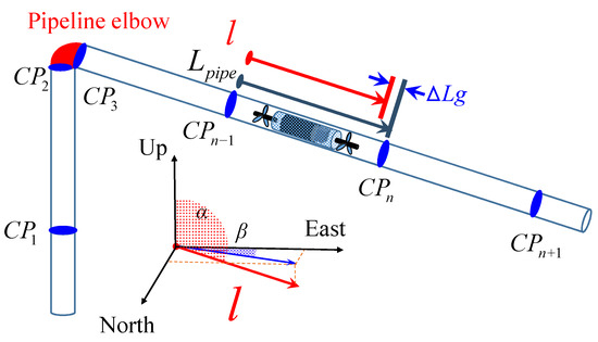 Figure 8 plots the structure of the pipeline. Δ L g = l L p i p e is the error of calculated pipe length and actual length. Constraint vector l reduces the dimensionality of configuration space and suppress the divergence of the position error. α is the angle between l and the vertical ( 0 < α < π ); β is the angle between the horizontal projection of l and the east ( 0 < β < π ). The theoretical pitch angle and azimuth angle can be determined by α and β . Moreover, PIG’s attitude has a significant change in pipe elbow, at this time Δ L g is no longer applicable in the algorithm.