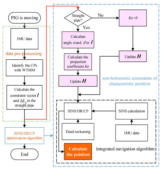 During the update phase of the SINS/DR/CP algorithm, dead reckoning provides continuous new position reference. Non-holonomic restrains the divergence of pitch and azimuth angle, and the calculation error of the straight pipe length compensates for the errors. Furthermore, the displacements of IMU measurement data caused by CPs significantly decrease the positioning accuracy, as analyzed in Section 2. Increasing the level of wavelet decomposition to 9 can smooth the signal and reduce the singularity, but this method will distort the measurement data when PIG keeps still. Another method is to temporarily discard the IMU measurement data within the collision time T p , and utilize the data before T p . After comparison, the latter method has higher positioning accuracy. Figure 9 is the flowchart of SINS/DR/CP algorithm.