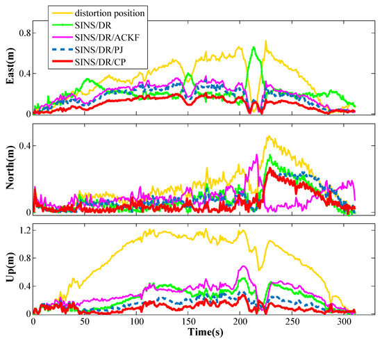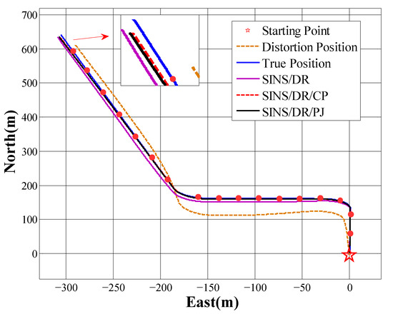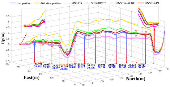 Figure 12 plots the pipeline trajectory calculated by different algorithm. The red line is the positioning result of the SINS/DR/CP algorithm. RTK is regarded as the pipeline true position because of the highest accuracy. The marks in the figure are the weld locations. The black text l C P indicates the distances between two adjacent CPs calculated by SINS/DR/CP, the blue text l P J indicates the distances between two adjacent CPs calculated by SINS/DR/PJ, both are in meters. By contrast, there is no obvious monotonic change in l C P , and the amplitude is closer to the true value. Comparing the result of SINS/DR/CP algorithm with the true trajectory, as shown in Figure 13, the maximum horizontal error is 42.2 cm and the maximum vertical error is 31.7 cm in the 300 m pipeline, the positioning error is 0.129%. Similarly, the positioning error of distortion position, SINS/DR, SINS/DR/ACKF, and SINS/DR/PJ are 0.571%, 0.276%, 0.268%, and 0.178%, respectively.