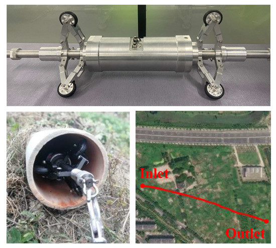 A real pipeline experiment was undertaken to evaluate the proposed method. The PIG and data processing software were designed and developed in Harbin Institute of Technology. As shown in Figure 11, the experiment field was in Songjiang, Shanghai (31.1090° N, 121.1738° E). The total length of the pipeline was 300 m, which was welded by multiple 30 m long pipes. The parameters of the weld strictly followed the national pipeline welding standard ( G B 50236). The girth weld was 4 mm higher than the inner surface of the pipe, the length of the girth weld was 10 mm. The MEMS-IMU was STIM300 with an output frequency of 100 Hz. The odometer was the Hall sensor ES3114, it measured the traveled distance by counting the number of rotations of the wheels. In addition, the microprocessor was STM32 with ARM Cortex-M, the data was stored on an SD card for offline processing. The calibration results of IMU are shown in Table 3.