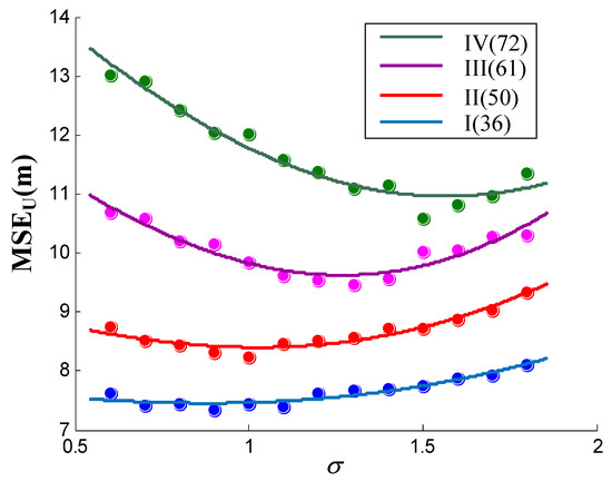where σ is the adjustment coefficient. Four pipeline experiments are conducted with different pulling frequency in the same site. Pulling force is difficult to quantify and control, so we count the total number of accelerometer burst noise by wavelet transform, as analyzed in Figure 4. The total number of burst noise in experiment I, II, III, and IV are 36, 50, 61, and 72, respectively. After that, we adjust σ to ask for the lowest mean square error (MSE) of the upward positioning error that changes significantly.
