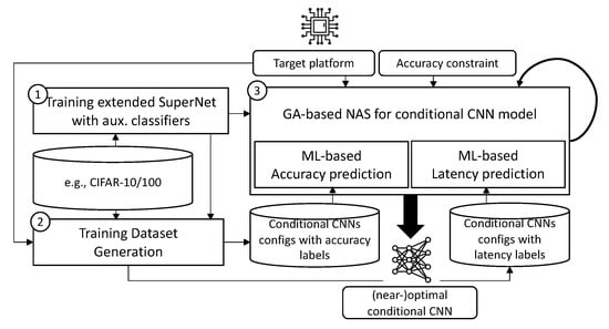 Figure 1 shows the overall structure of CondNAS and its design flow. Similar to OFA, the SuperNet is first trained independent of target platforms (①), then the GA is later performed for the given target platform. The SuperNet is extended such that it can incorporate the various configurations of auxiliary classifiers. The GA in CondNAS adopts machine learning-based accuracy and latency prediction models to evaluate the score of an arbitrary conditional CNN encountered in the search. To this end, before the GA starts, the training dataset generation module extracts a number of various conditional CNNs from the SuperNet and generates their accuracy and latency label for the given target platform (②) in a similar way to BPNet: it actually runs and profiles the conditional CNNs, feeding the calibration dataset. The generated datasets are used for training the prediction models, which are then used in the search of (near-)optimal conditional CNNs for the given target platform (③). The SuperNet and the accuracy prediction model are trained only once for a new input image dataset, whereas the latency prediction model should be trained whenever the target platform changes.