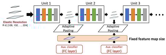 The second challenge for integrating OFA with BPNet is how to attach the auxiliary classifiers. SuperNet can take multiple input sizes and the auxiliary classifier attached to the SuperNet should be able to. As the auxiliary classifiers are fully connected layers, they are dependent on the size of input feature maps, unlike convolution layers. To address this problem, we propose to add an adaptive pooling layer before an auxiliary classifier so that the different sized input feature maps can be converted to a fixed size input feature map, as shown in Figure 2. While conventional pooling layers determine the output feature map size using stride and padding parameters, adaptive pooling layers compress the feature maps into a fixed size feature map. However, this can incur accuracy loss as average pooling layers in the proposed SuperNet convert the feature maps based on the minimal input image size. This minimizes the overhead of auxiliary classifiers in the inference and makes the training of the SuperNet with auxiliary classifiers more tractable: when the actual input size is larger than the minimal size, the information loss occurs. Although the information loss can lead to the accuracy loss, the reduced information can also play the role of a regularizer and prevent overfitting, actually increasing the overall accuracy. We examine the impact of average pooling on the overall accuracy.