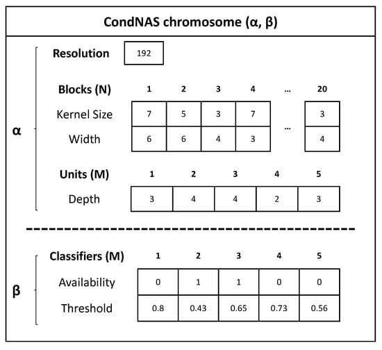 Once a SuperNet with auxiliary classifiers is trained by progressive shrinking, GA searches for the optimal conditional CNN for the target platform. Figure 3 shows the chromosome used in CondNAS’s GA module. The base CNN architecture () is encoded in three parts: image resolution, Blocks (N), and Units (M). A base CNN has five units, each of which has from two to four blocks (i.e., depth is at least two and the maximum number of blocks in the entire network is 20), and a block has two genes for kernel size and width, respectively. Thus, is encoded in 1 + 20 × 2 + 5 = 46 genes. On the other hand, conditional CNN architecture () encodes the availability and threshold of each auxiliary classifier after each of five units, resulting in 5 × 2 = 10 genes.