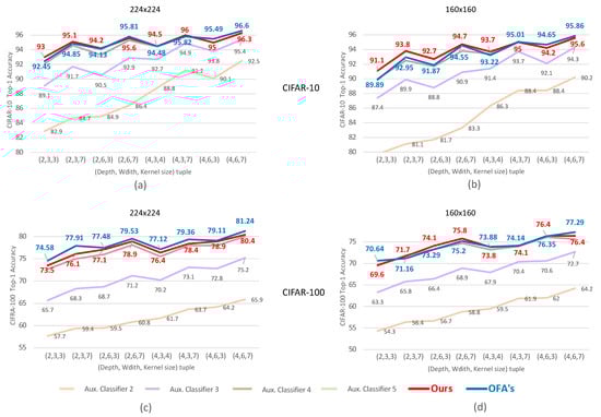 Figure 4 shows the test accuracy of the original SuperNet from OFA and the proposed extended SuperNet with auxiliary classifiers when depth (i.e., number of layers in a unit), width (i.e., number of channels), and kernel size are varied. For CIFAR-10, the proposed SuperNet with auxiliary classifiers shows 0.2%p of very little accuracy loss compared to the original OFA SuperNet accuracy. For CIFAR-100, the accuracy loss is also as small as 0.8%p. The accuracy of the last two auxiliary classifiers (ID 4 and 5) show accuracies comparable to the final classifier, which indicates that the test data in CIFAR-10 and CIFAR-100 are sufficiently easy to classify, already at the point of the fourth auxiliary classifier. In contrast, the first auxiliary classifier shows very poor accuracy, based on which we do not consider attaching an auxiliary classifier after the first unit in the design space exploration.