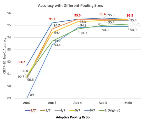 Figure 5 shows the accuracy when the adaptive pooling size is varied. The adaptive pooling size is defined to be the output of an adaptive pooling layer. In the proposed SuperNet, auxiliary classifiers are attached through an adaptive pooling layer so that the feature map size in the classifiers is fixed. Due to this, we expected a certain level of accuracy loss. As shown in Figure 5, however, most of the sizes except for one led to an increased accuracy by up to 2.17%p. Counter-intuitively, the smallest size, 64 × 64, shows the highest accuracy. It is because adaptive pooling normalizes largely distributed information, preventing overfitting. Note that, without adaptive pooling, we observe that the SuperNet with auxiliary classifiers cannot be trained.