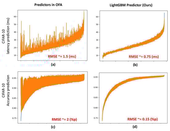 For accuracy and latency prediction of a conditional CNN, we devised light gradient boosting machine (LightGBM) models that take as input an arbitrary conditional CNN and predicts its accuracy and latency. The train dataset was generated as explained in Section 3. The number of for each was 200 while the number of was 3000, resulting in the total size of the train data being 600,000. To compare the accuracy of the proposed LightGBM model with the MLP model architecture from OFA, which consists of the three layers, they were trained with the same dataset of 600,000 arbitrary conditional CNNs for 2000 epochs. It took about 6.8 h for the MLP models, whereas LightGBM models took only about 40 s on a Titan RTX GPU.