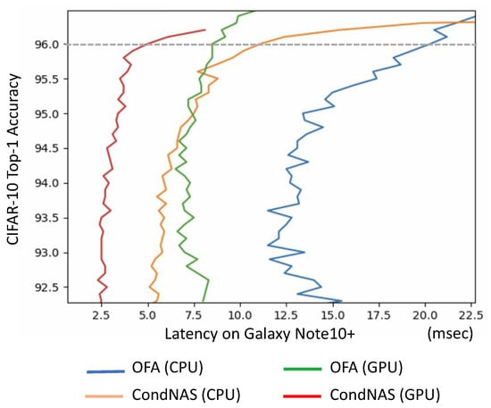 When the BPNet method was applied to the CNN obtained by OFA, the resultant conditional CNN could not maintain the accuracy of 0.96, but resulted in 0.925 with the latency of 14.98 ms. The conditional CNN obtained by CondNAS for the same accuracy of 0.925 showed 5.10 ms, achieving a 2.94× speedup.