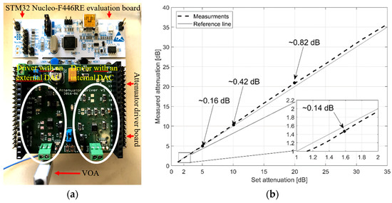 Moreover, the implemented attenuator driver is utilized together with an STM32 Nucleo-F446RE evaluation board, providing a broad spectrum of capabilities. It incorporates an STM32F4 microcontroller ARM Cortex M4 series, powered by 3.3 V. Furthermore, the attenuator driver board implements external DAC, namely Texas Instruments DAC8571 characterized by 16-bit resolution, 10 μs settling time, and ±4 mV accuracy. Since the VOA has a low input impedance of 100 Ohm, a higher amount of output DAC8571 DAC power is achieved using an AD8532ARM operation amplifier that plays the role of an impedance transformer. In order to evaluate the performance of the built hardware, set attenuation versus induced optical attenuation into an optical fiber is measured and compared with a reference line that represents the ideal case. The results in Figure 1b offer <0.16 dB attenuation accuracy within the most used 0–5 dB optical attenuation range in terms of turbulence fading.