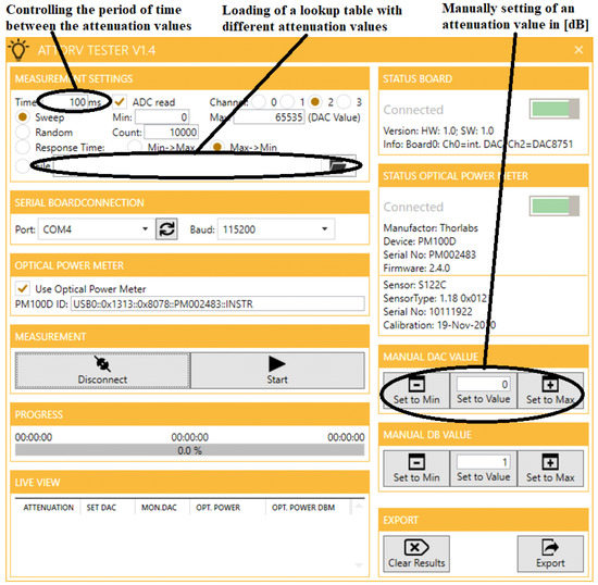 The developed hardware FSO fading emulator built with COTS components is given in Figure 1 (i.e., Figure 1a) while its controlled software is provided in Figure 2. Its performance aims to represent the broad spectrum of Mie scattering and atmospherics turbulence scenarios that are featured with 0.1 Hz–1 kHz fading bandwidth and optical attenuation less than 10 dB. In particular, the real dynamic changes of the received FSO optical power are translated here into a laboratory environment leveraging MEMs-based VOA at 1550 nm wavelength with SMF–28 (Single Mode Fiber) having MFD = 10.4 μm. On the one hand, the transmitted fundamental transverse mode TEM00 (Gaussian optical beam) in a typical FSO communication scenario is launched into an SMF with 80% efficiency supported as a linearly polarized LP01 mode. On the other hand, the FSO architectures for near- and deep-space communication are especially based on SMF optical components that provide exceptional performance. Furthermore, the obtained VOA operates within 0–60 [dB] dynamic attenuation range and has 0–1 kHz fading bandwidth (response time up 1 ms), covering a broad scope of atmospherically induced fading.