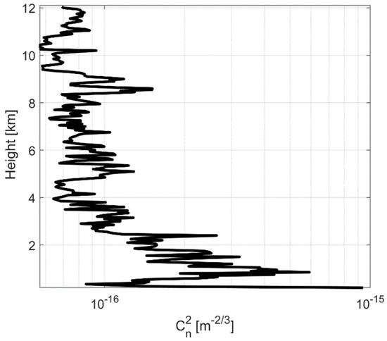 A key challenge is the generation of accurate atmospheric turbulence data considering the required resources for a real measurement campaign. Therefore, a precise solution is used to obtain the vertical profile of refractive index structure parameter based on RAOB databases containing meteorological information for various geographical locations [7,23]. The radio sounding data include atmospheric vertical profile up to 30 km of various atmospheric parameters such as height z, pressure P, geopotential height, absolute temperature T, dew point temperature, relative humidity, mixing ratio, wind orientation and velocity, potential temperature θ, equivalent potential temperature, and virtual potential temperature. The proposed model is based on the Tatarski energy spectrum [24]. In particular, the model that applies the structure–function formulation of Tatarski is given in Equation (1) [25].